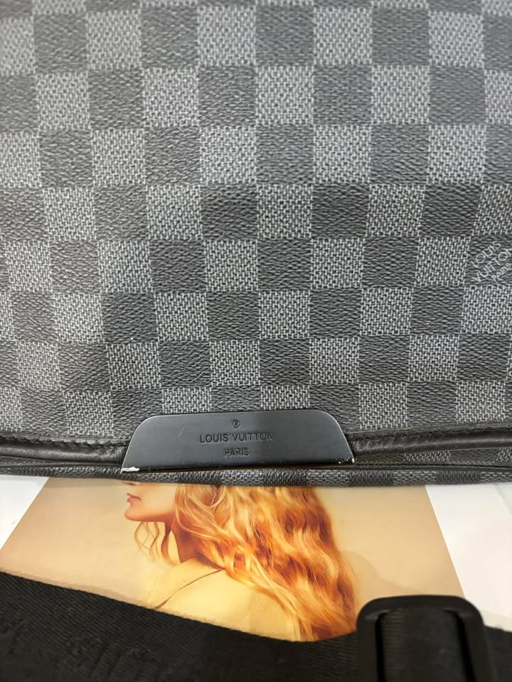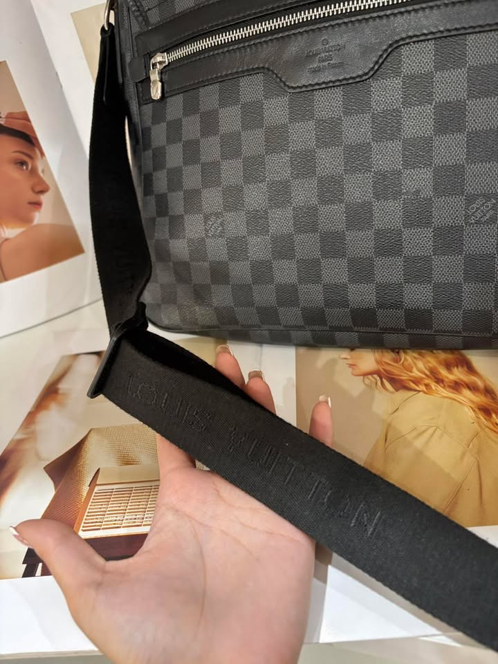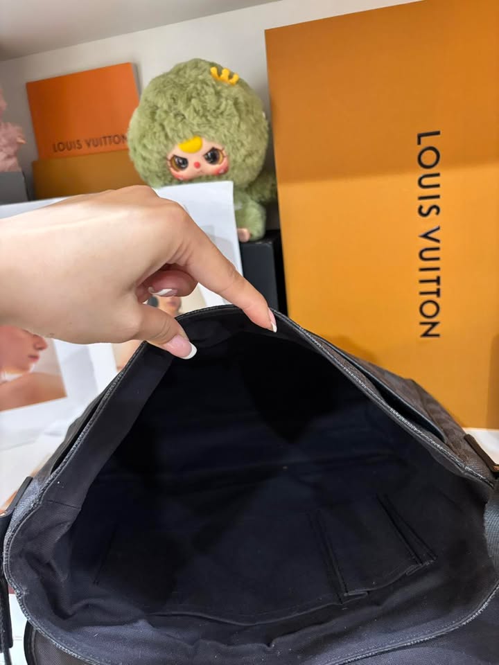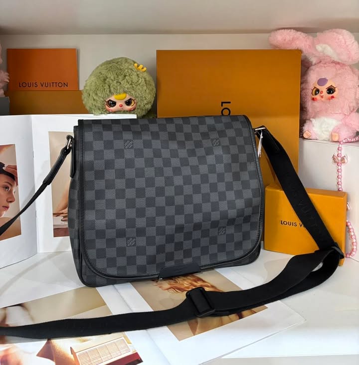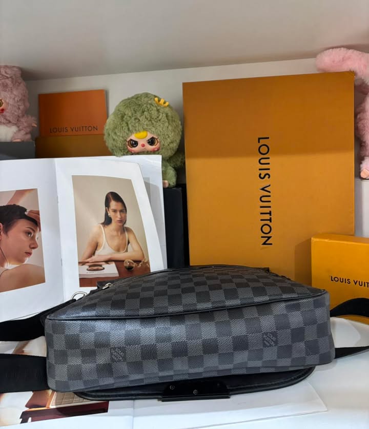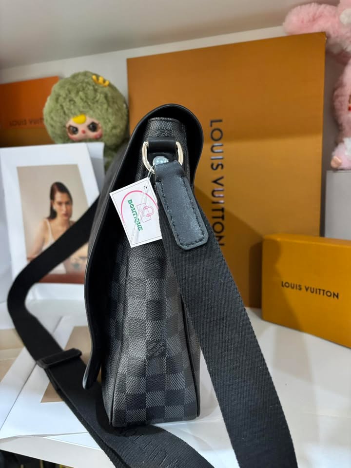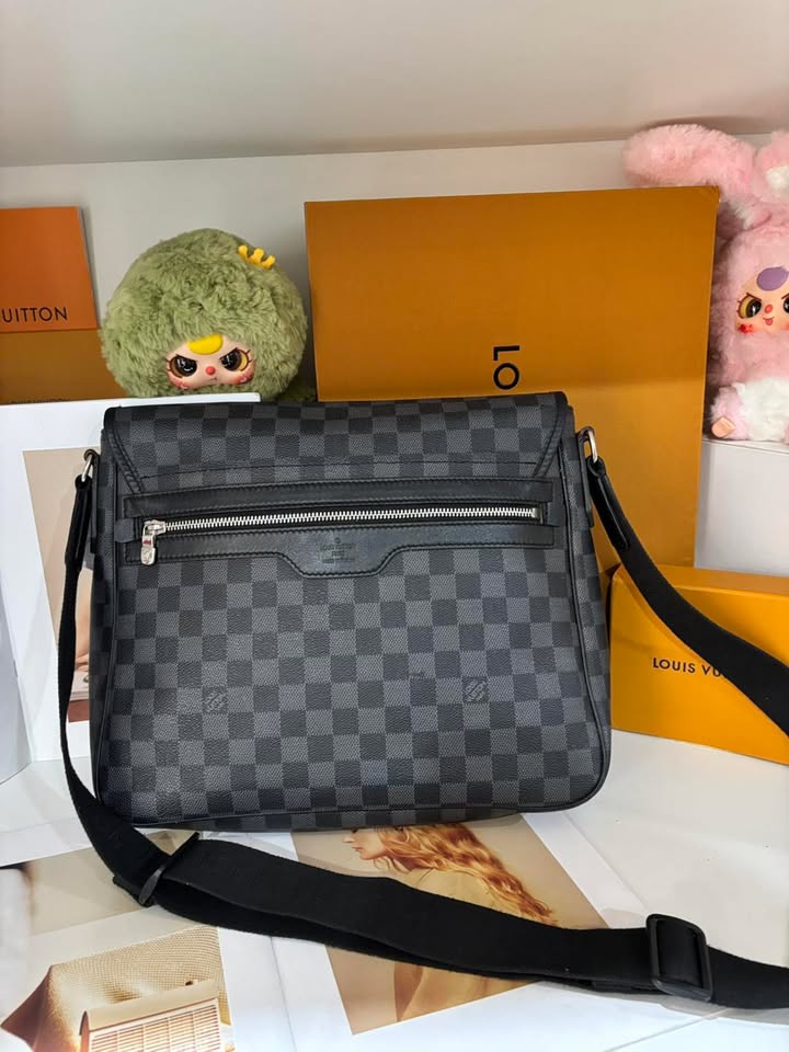 ✨Thiết kế: Dáng messenger, nắp gập có khóa nam châm, dây đeo bản to bằng canvas dập chữ Louis Vuitton