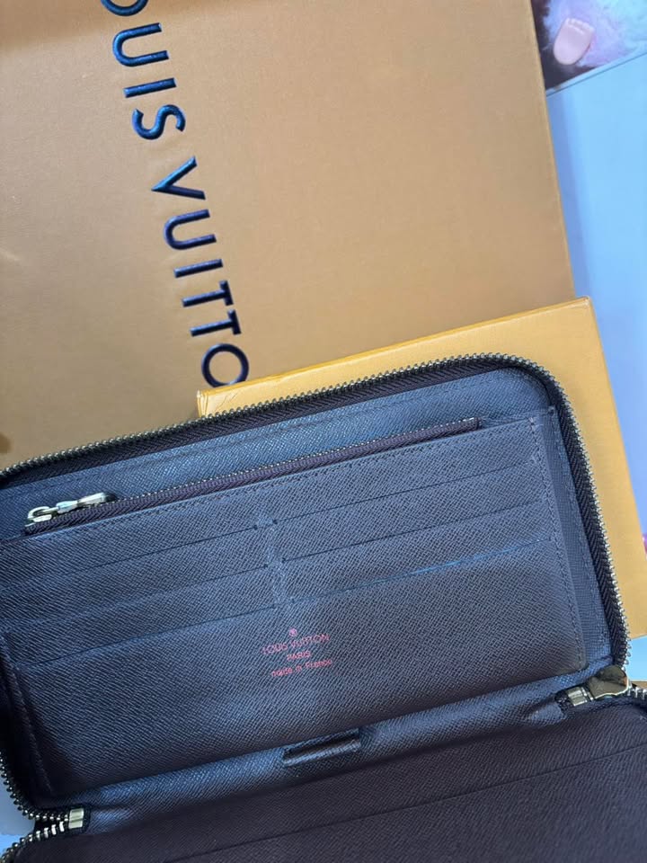 ✨Louis Vuitton Zippy Wallet cũng cùng họa tiết Damier Ebene, thiết kế dáng dài, khóa kéo chạy quanh, tiện dụng cho nhiều ngăn đựng